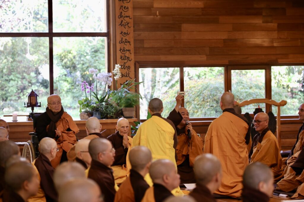 Acknowledging the challenges the community has faced in recent months, he lifted up a card marked “100%” — Thay’s reminder to live and practice wholeheartedly, with full presence in every step and every breath. This “100%” spirit, he said, is the Dharma seal of Plum Village, yet it seems to have faded over time.