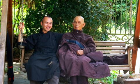 Their encounter in the Looking Afar Hut that morning was so heart-warming. Thầy embraced the Venerable many times, invited him to sit beside Thầy, and held his hands like two kindred spirits. That day, Thầy’s eyes were full of joy. The joy of reunion, affection, and gratitude for Venerable Giác Viên’s care of The Nursery Garden (the common name for our Thai centre). I opened the letter that the Venerable had written to Thầy. On the envelope it was written: “Respectfully to Thầy, this rare visit that nourishes our teacher-disciple bond. From your disciple, Thích Giác Viên”. In the letter was a poem titled The Spiritual Flame, of which I can recall a few lines as follows:
