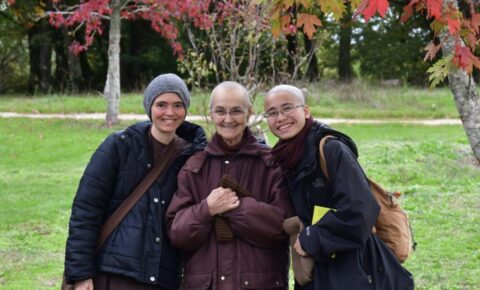 [Sr Thao Nghiem] When I first came to Plum Village, I could not feel the love from Thay yet. Raised and ordained in Vietnam, I did not have a chance to be near Thay during my formative years. After staying in Plum Village for a while, I was able to appreciate Thay’s presence and warmth. Once Thay asked me, “Do you feel comfortable sitting with Thay?” I replied, “It’s okay as long as I don’t have to say anything, because I really don’t know what to say.” Thay smiled and said, “You do not need to say anything. You only need to enjoy sitting, breathing and feeling at ease. That’s enough.” From then on, the experience of sitting with Thay became pleasant, calm and profound.
