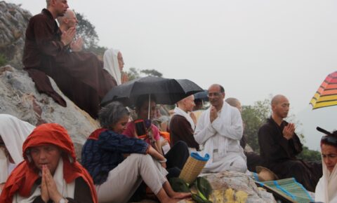 The rocky outcrop was supposedly the Buddha’s favourite retreat and one of Thich Nhat Hanh’s as well. Thay conducted his first ordination there in 1988, and, in that tradition, the monastics of Plum Village transmitted the Five Mindfulness Trainings to the tour group at Vulture Peak.