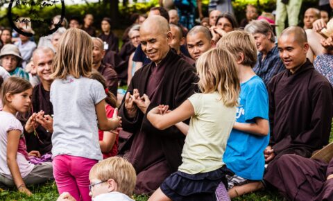 At this moment, I invite everyone to continue Thay’s legacy by maintaining this practice of listening to the sound of the bell in your own home, workplace, or wherever you may be. You may like to install a chiming clock in your living room or kitchen to remind you to stop. You may install a digital mindfulness bell on your laptop or smartphone and program it to sound periodically, to help you stop during your busy day. When you stop, close your eyes, recite the gatha, and come back to your “true home,” envisioning all of us breathing together throughout this land and around this planet, creating a collective energy of peace and kindness, and connecting us all in a moment of interbeing. This is not a practice of magic or romanticized imagination; it has a real potential to bring immediate benefit to ourselves, to those near, and to everyone that may randomly cross our mental field and may not even be in our awareness. No energy is ever lost. No ripples in the pond are without some effect, some retribution. No mental intention of kindness and acceptance will be lost. I invite everyone to help us maintain this collective field of good-will as opposed to ill-will, of heart force instead of aggression, no matter what or who confronts us, and together we can support one another on our path to build the beloved community, to bring change, and contribute to our collective awakening.