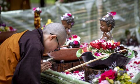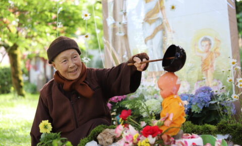 In her Dharma talk, Sister Chan Duc shared that as we bathe the baby Buddha during this celebration, we are also bathing the seed of awakening—of deep understanding—within ourselves.