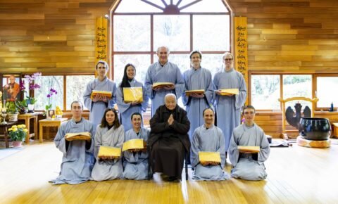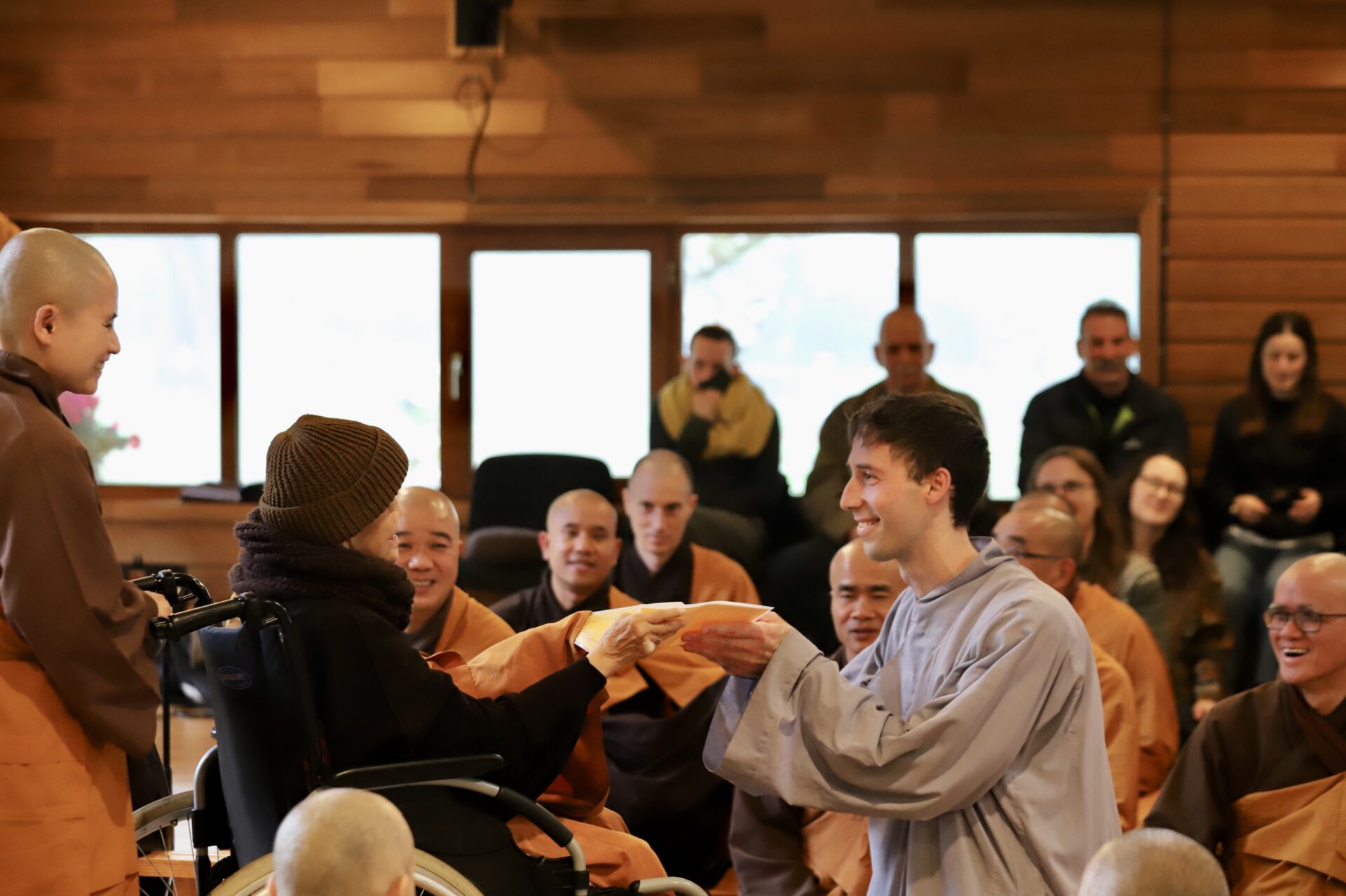 It has been a journey not only for Nick, but also for his family, and particularly for his parents. And for his parents, I think it has been a real practical lesson in a fundamental core concept of Buddhism: and that is letting go. Because I was reflecting this morning on how as parents, we have all sorts of hopes and wishes and expectations for our children, which perhaps over time we come to realize are not necessarily their hopes and expectations. And the journey that Nick has been on and that we have been on has brought us to this point today. The wonderful ceremony that we had this morning made me realize that ultimately what you want for your children, despite your own hopes and wishes and expectations, is happiness and fulfillment. And looking at Nick and being part of the ceremony that took place this morning, those two words just came back to me when I looked at Nick. That’s what I felt and realized: happiness and fulfillment. And I guess it’s summed up in other words in the Plum Village song that keeps on coming back to me in relation to Nick. This morning I felt truly that “he had arrived, he was home.”