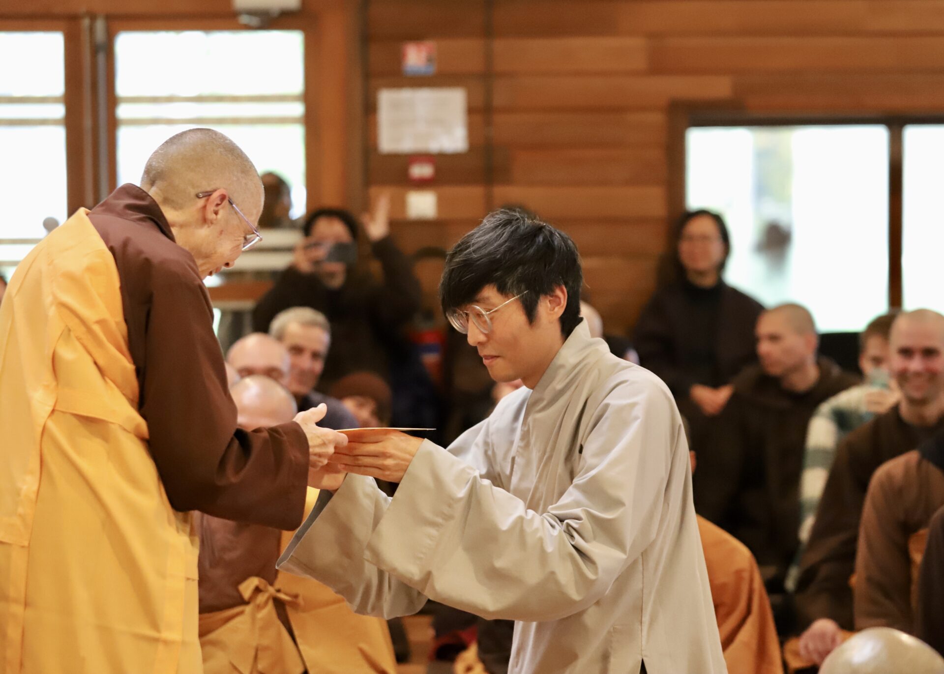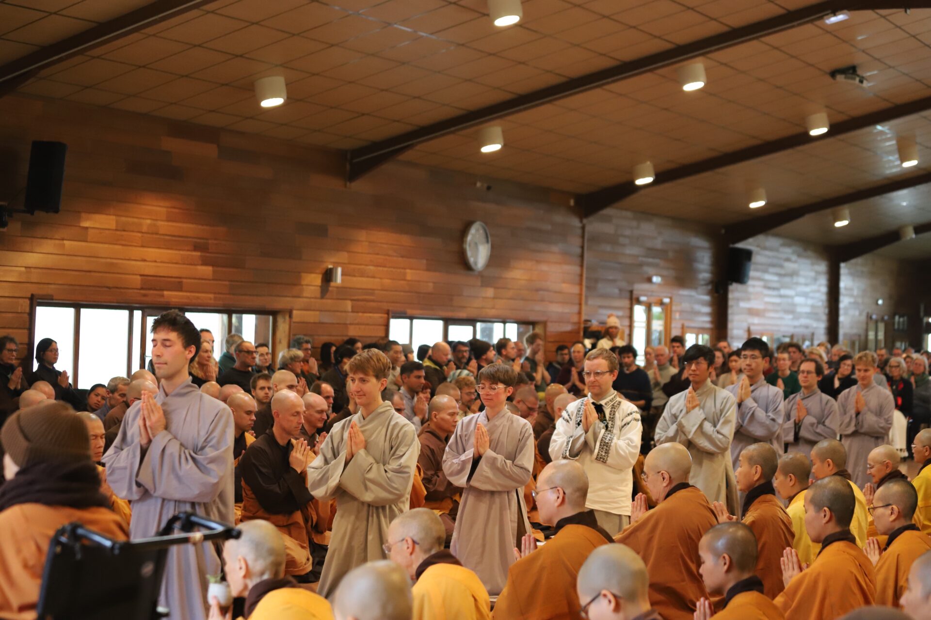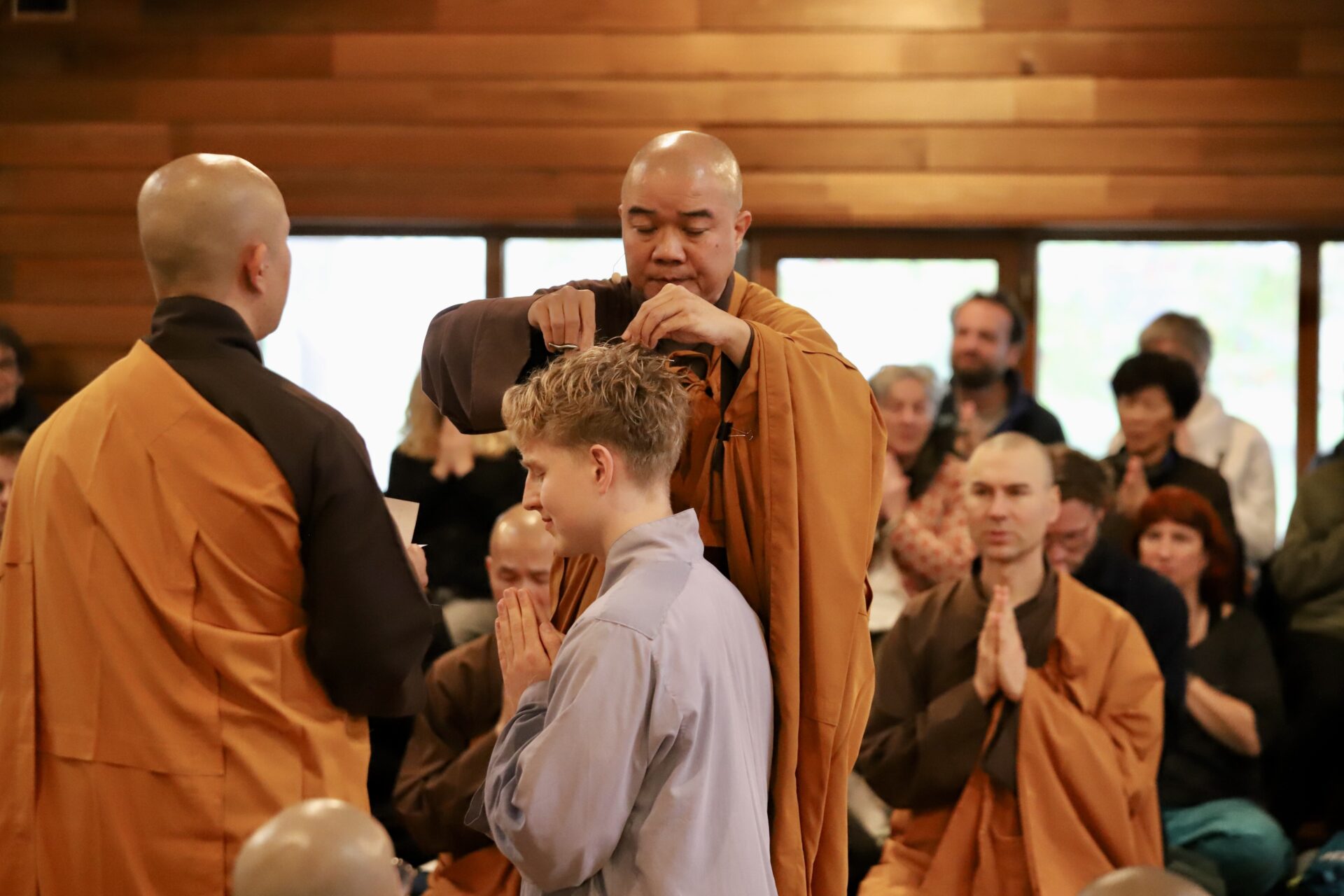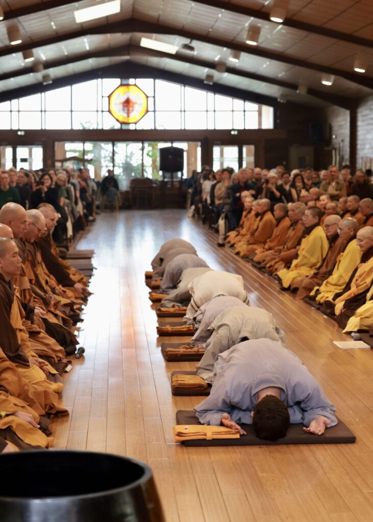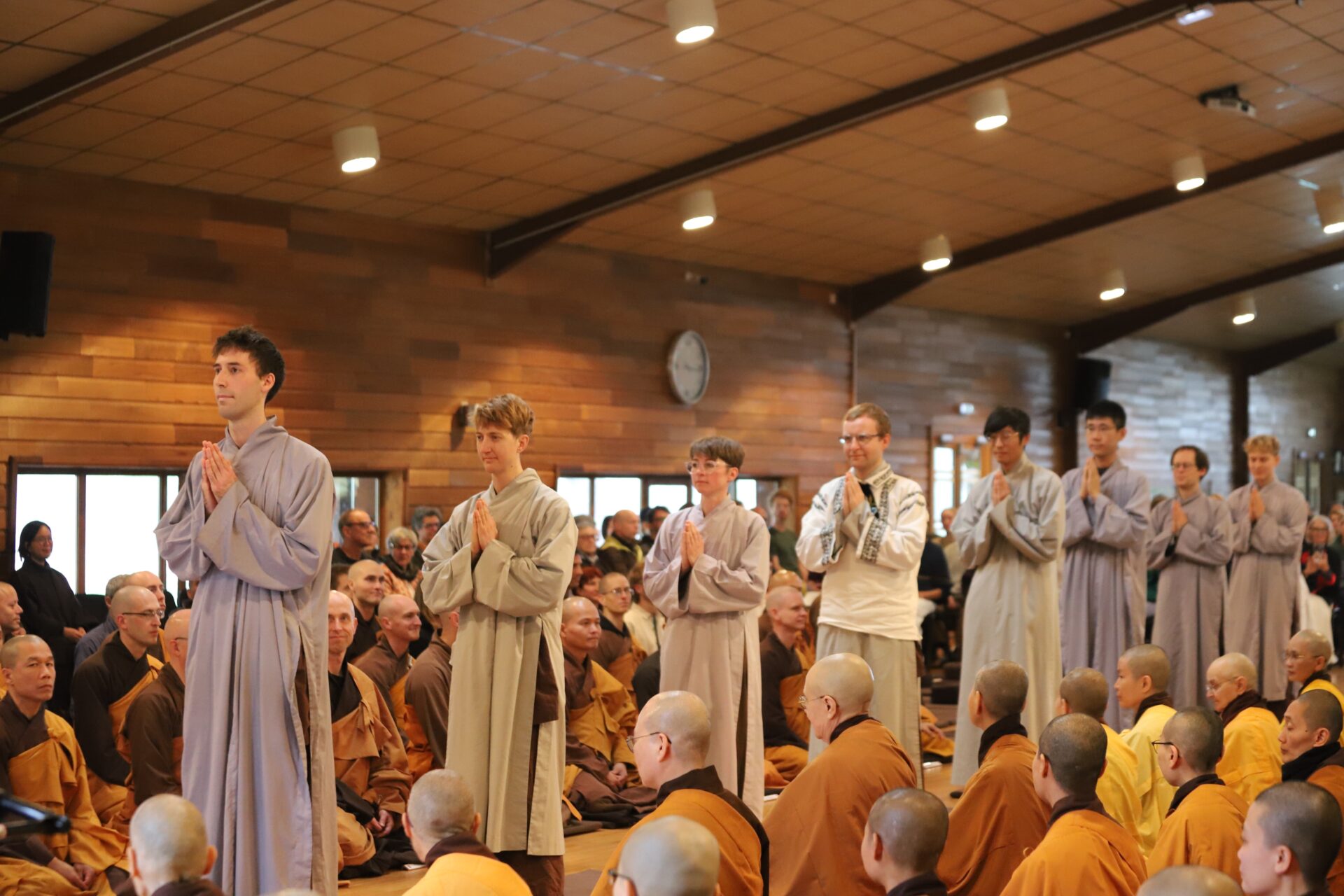 On 9 November in the Still Water Meditation Hall of the Dharma Cloud Temple (Plum Village, France), a group of eight young people shed their hair to become novice monks and nuns, as witnessed by their families, friends, and the entire Plum Village community. Coming from many different countries (Australia, Sweden, France, Taiwan, China, and Germany), they have committed themselves to embark on this path of healing, transformation and service in order to fulfill their deepest aspirations.