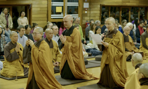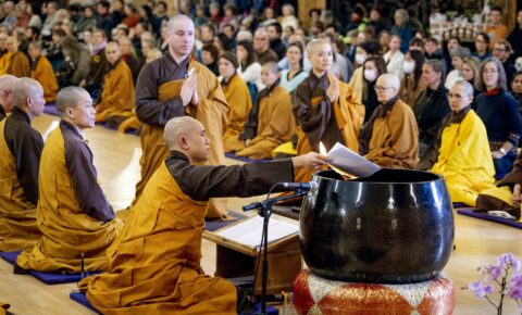 Cher Thầy, alors que nous terminons l’année, et que votre corps physique semble jouer à cache-cache, nous nous donnons la possibilité d’avoir du chagrin, de pleurer et de nous souvenir de vous. En même temps, nous revenons au moment présent, en regardant profondément pour vous reconnaître dans chaque frère et chaque sœur, dans chaque bouton de fleur et chaque nouvelle feuille, dans chaque nuage qui passe et chaque beau sentier de promenade – dans les nombreuses merveilles de la vie. Certain.e.s d’entre nous ont été vos étudiant.e.s toute leur vie, d’autres ont participé à des retraites, d’autres encore ont lu vos livres, d’autres enfin ne vous ont jamais rencontré mais ont passé des moments à savourer une tasse de thé en silence ou à admirer la beauté de la nature avec des yeux clairs. D’une manière ou d’une autre, nous vous connaissons, Thầy, et nous pouvons vous retrouver dans notre propre pratique.