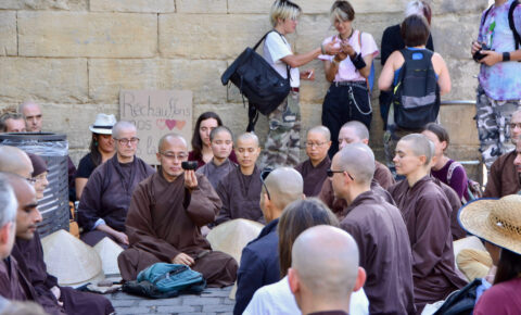 …Nos actions doivent être enracinées dans une reconnaissance profonde de l’unité et de la dignité de la vie, et dans une conviction profonde que toute vie est sacrée. En embrassant le sens du sacré, nous cultivons la compassion et l’amour pour toute vie. Nous cultivons la frugalité, la simplicité, la modération et la retenue. Nous devenons l’incarnation du changement, tout en exigeant des systèmes externes qu’ils changent. La transformation personnelle et la transformation politique deviennent un processus de soutien mutuel, comme marcher sur deux jambes.
