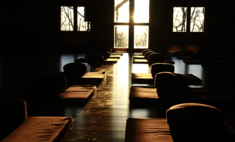 Assis au pied De l'arbre de la Bodhi Notre posture Est stable Corps, parole et esprit Calmes et tranquilles Il n'y a plus de pensées Ni de bien ni de mal Notre corps et notre esprit En parfaite pleine conscience Nous redécouvrons notre nature originelle Et abandonnons la rive de la confusion Noble Sangha, unifions tout notre être dans la méditation Namo Shakyamunaye Bouddhaya (x3)
