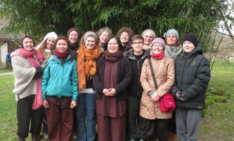 Kitty: My mother purchased a house near Plum Village about 30 years ago, not knowing that there was a Buddhist monastery nearby. In 1995, she learned about Plum Village, visited, and then introduced me to Plum Village and Thich Nhat Hanh. She asked me to come to a 21-day retreat in 1996. Although I was pregnant at the time, I came anyway, and slept through many of the sessions. But I was awake enough to be deeply moved by Thay’s talk on the Heart Sutra and learned to follow my breath.