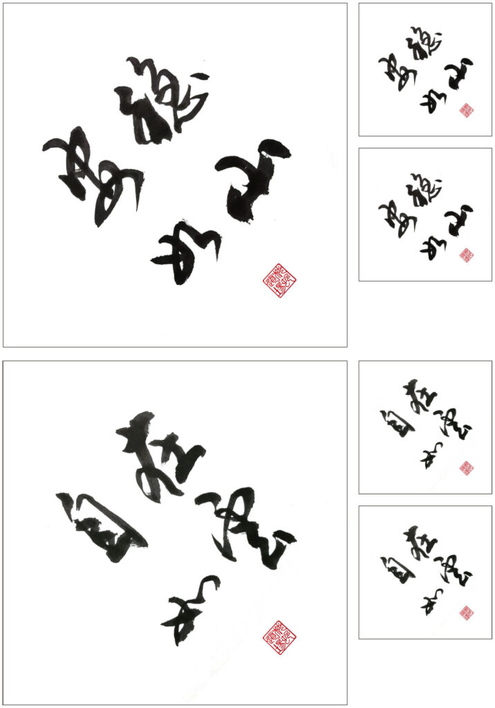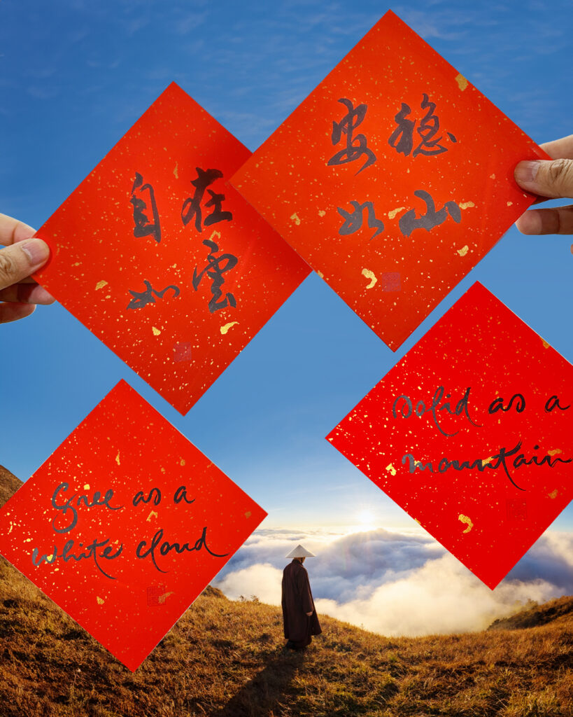 世界各地的梅村禪修中心都會將這些書法打印出來,張貼到彩色卡片上,然後將它們貼在齋堂、禪堂和生活區,準備慶祝農歷新年。我們把它們 (用一根小棉線) 掛在剛盛開的海棠和梅枝上,用其照亮我們的房間。